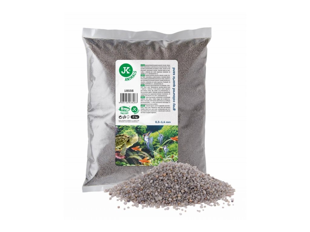 Barevný křemičitý písek do akvárií a terárií. Balení 2 kg. Frakce 0,3–1,4 mm. Barva: šedá. Voděodolný, vysoká barevná a chemická stálost.