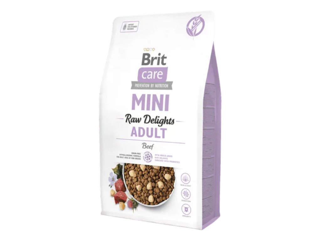 Brit Care Mini FD Raw Delights Beef je kompletní bezobilné krmivo s hovězím masem a mrazem sušenými kousky pro dokonalou chuť.