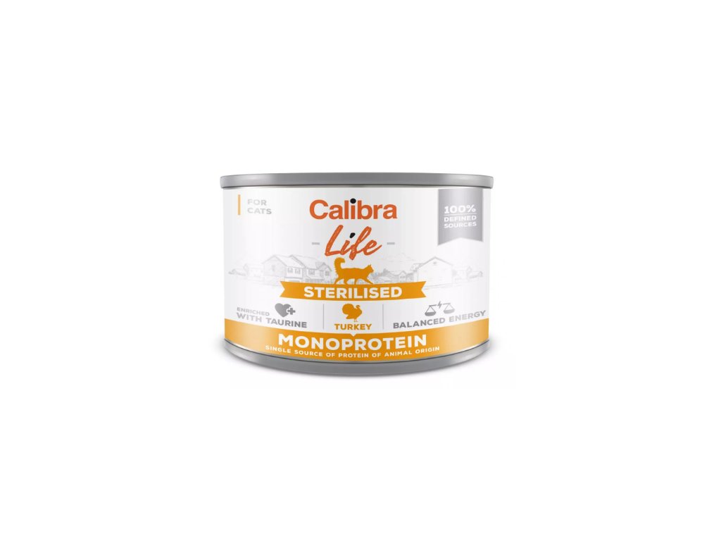 Calibra Cat Life Sterilised Turkey – receptura konzervy s krůtím, která je určena pro dospělé kočky, vhodná pro kočky po kastraci.