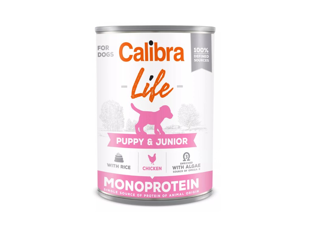 Calibra Dog Life Puppy&Junior Chicken with Rice - receptura konzervy s kuřetem, kuřecími srdíčky a rýží je kompletním krmivem, která je určena pro štěňata a je vhodná také pro březí nebo kojící feny.