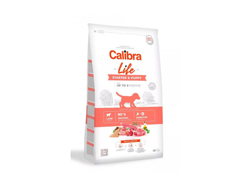 Calibra Dog Life Starter & Puppy Lamb jsou kompletní granule pro štěňata (do 3 měsíců) vhodné i pro březí nebo kojící feny. Krmivo s kvalitními jehněčími bílkovinami a nízkým obsahem obilovin zastoupenými rýží dodají nezbytné živiny během období náročného na výživu. Bílkoviny v receptuře jsou z 90 % tvořeny bílkovinami živočišného původu. Receptura je sestavena jako monoproteinová - pouze jeden zdroj živočišných bílkovin. Receptura je hypoalergenní. Pro citlivé zažívání štěňátek po odstavu je samozřejmostí vysoká stravitelnost krmiva. Prebiotika a laktobacily pomohou správnému trávení, a ty spolu s ß-glukany mají zároveň příznivý vliv na posilování imunitního systému štěňátka. Kvalitní výživa je obohacena o lososový olej pro péči o kůži a srst a vybrané vitaminy a minerály pro správnou funkci a vývoj celého organismu štěněte a jeho imunitního systému.