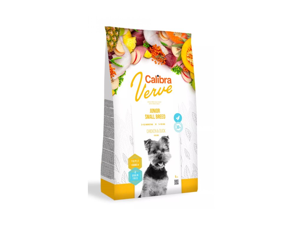 Calibra Dog Verve Junior Small Breed (Chicken & Duck) je kompletní suché krmivo s čerstvým masem a bez obilovin. Receptura je určená pro mladé psy ve věku 3-12 měsíců malých plemen s hmotností 1-10 kg.
