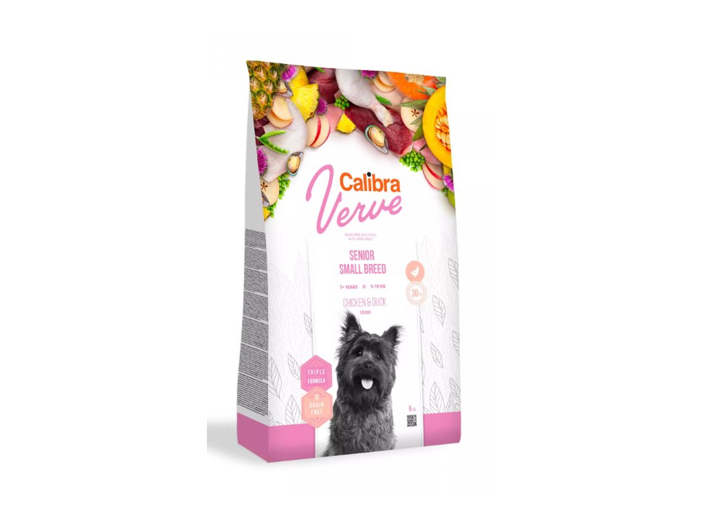 Calibra Dog Verve Senior Small Breed (Chicken & Duck) je kompletní suché krmivo s čerstvým masem a bez obilovin. Receptura je určená pro dospělé psy nad 7 let malých plemen s hmotností 1-10 kg. Složení s 30 % čerstvého kuřecího masa a kvalitním kachním proteinem je adekvátní výživa pro psa, která odpovídá nejvyšším požadavkům na přirozené stravování v souladu s jeho fyziologickými potřebami.