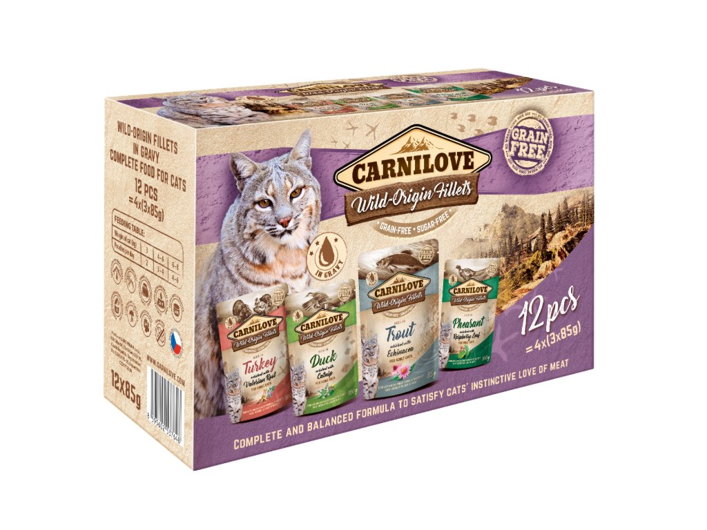Kapsičky s kousky masa divokého původu ve filetech. Kompletní krmivo nebo chutný topping ke granulím.