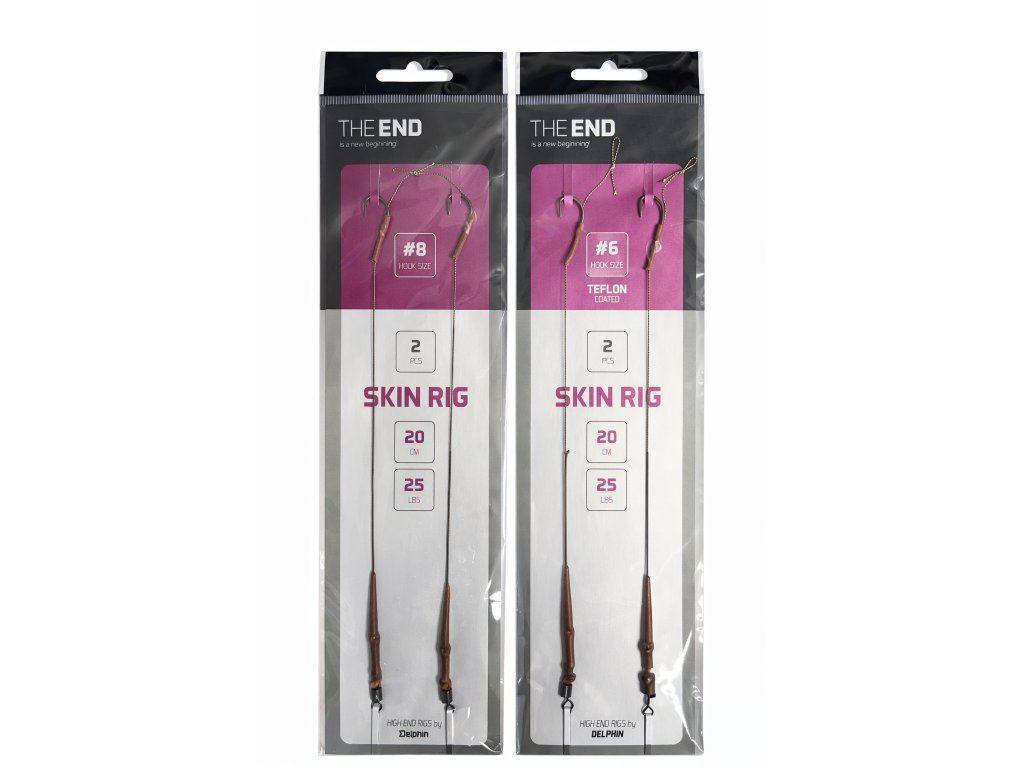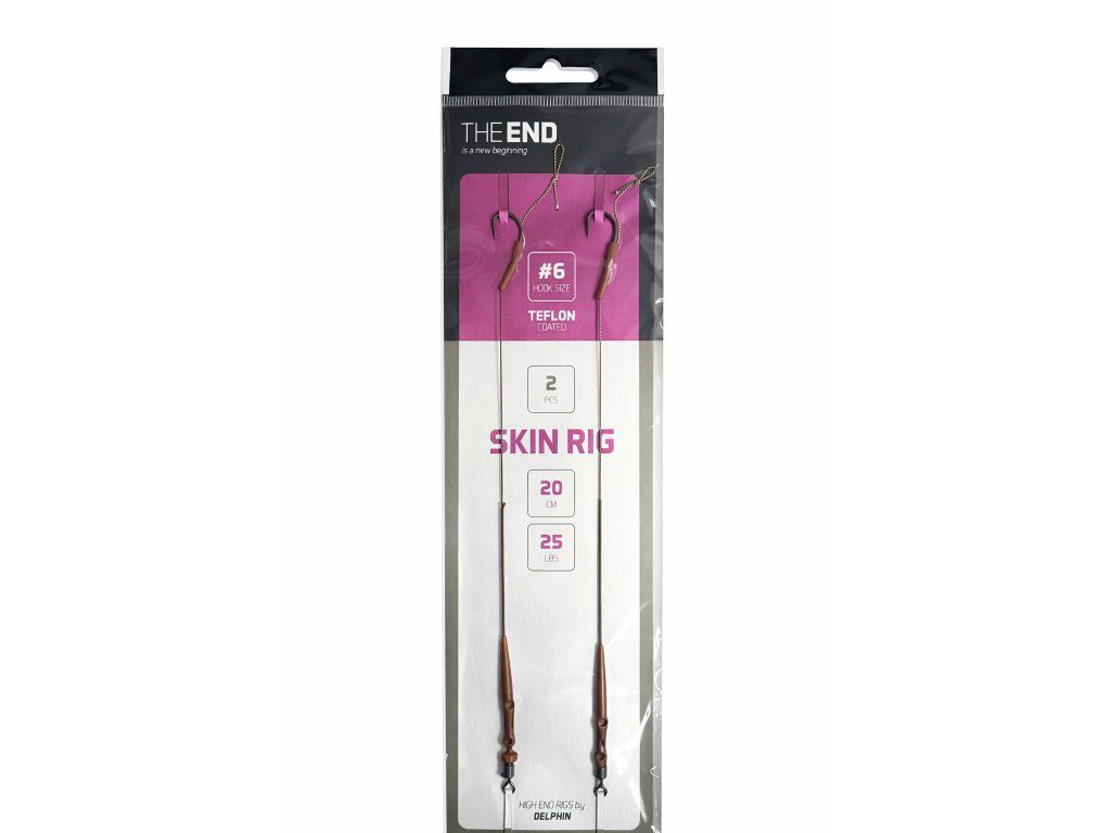 Delphin The End Skin Rig je kvalitní hotový kaprový návazec navržený pro maximální efektivitu při lovu kaprů. Kombinuje tuhý potahovaný materiál (skin) s odhalenou částí u háčku, což zajišťuje přirozený pohyb nástrahy a agresivní zásek.