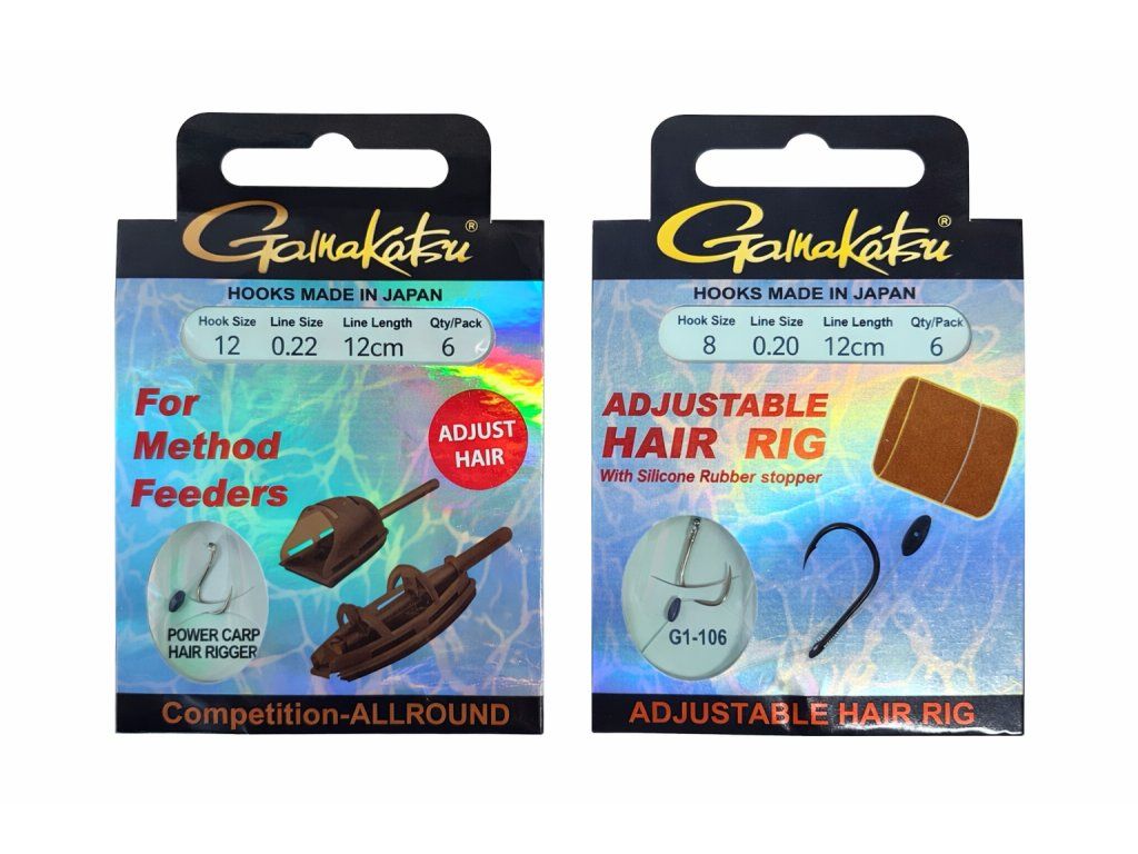 Hotové návazce japonské značky Gamakatsu určené pro kaprařinu a feeder. Díky systému nastavitelného vlasu (Adjust Hair) lze jednoduše přizpůsobit délku vlasu podle použité nástrahy (pelety, boilies, kukuřice).