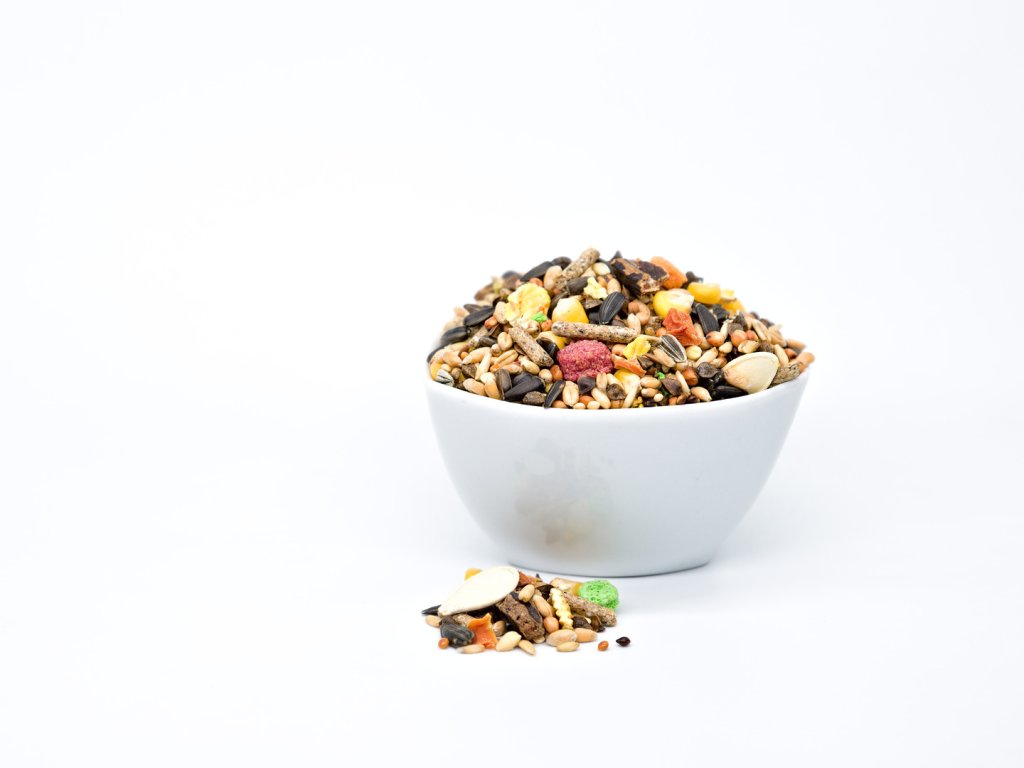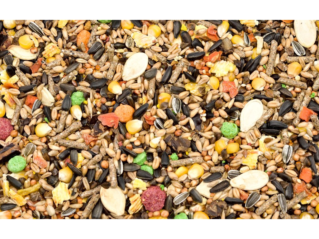 - Pohanka obecná, Ječmen Perličný ječmen, Žlutá kukuřice, Pšenice, Červený čirok, Černá slunečnicová semínka, Lněné semínko hnědé (omega3), Slunečnice pruhovaná Iryga, Oves loupaný (ovesné vločky), Perlové proso, Červené proso, Lisovaná kukuřice, Sušená mrkev, Dýně (dýňová semínka), Rohovník, Vita Karm granule, Rostlinné pelety (3 typy), Vitalizovaný doplněk.