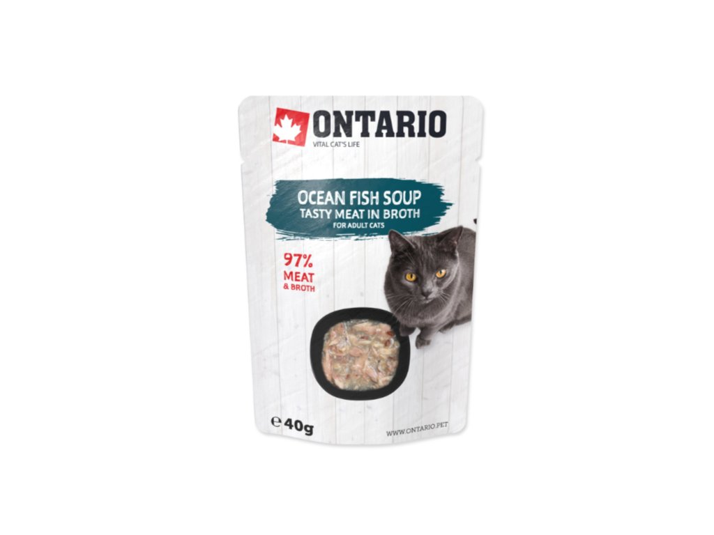 Doplňkové krmivo pro dospělé kočky – polévka s kousky makrely a tuňáka, kterou můžete dopřát samostatně nebo jako doplněk k suchému krmivu.