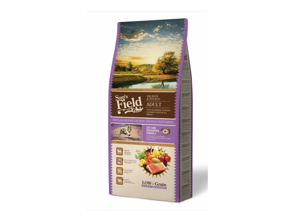 Sam's Field Low Grain Adult Salmon & Potato. Superprémiové hypoalergenní bezpšeničné krmivo s vysokým obsahem lososa 31 %.