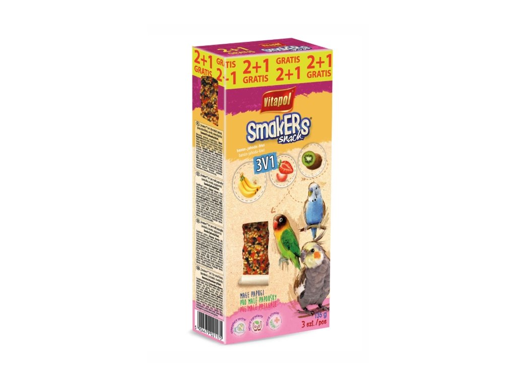 Vitapol klasy 3v1 pro malé papoušky jako jsou andulky, korely nebo agapornisi. 3 klasy, mix: banán, jahoda, kiwi. Doplňkové krmivo.